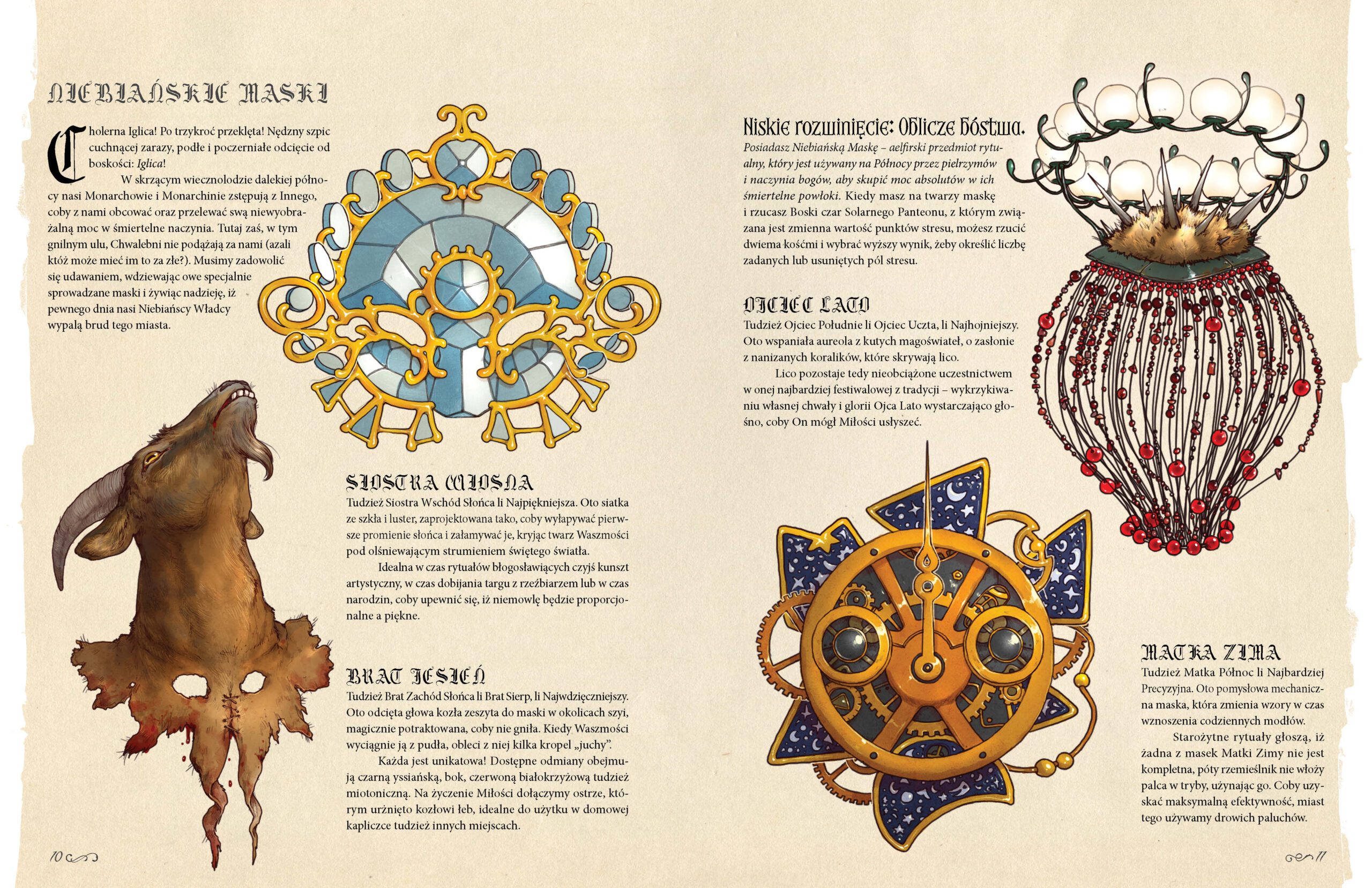 Poznaj najlepsze maski na rynku dzięki Księdze Masek – fachowo napisanej przez uznaną wytwórczynię masek Lysk Smukłe-Dłonie-Szarpiące – która zawiera szczegóły, mechanikę i piękne kolorowe ilustracje autorstwa Iguanamouth.