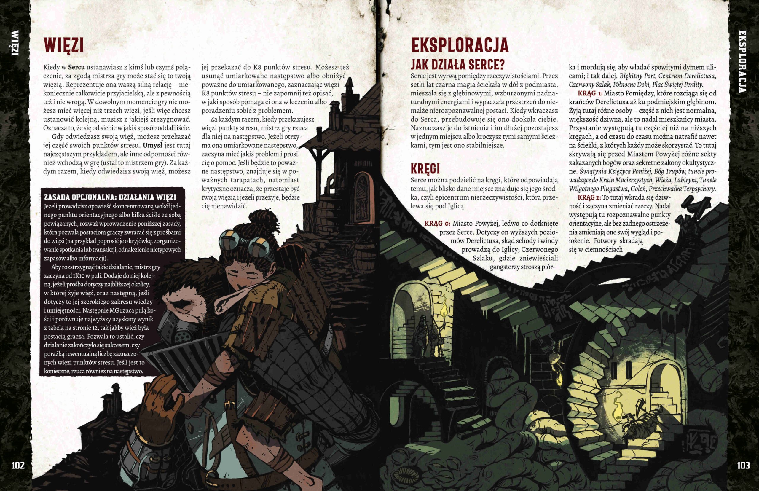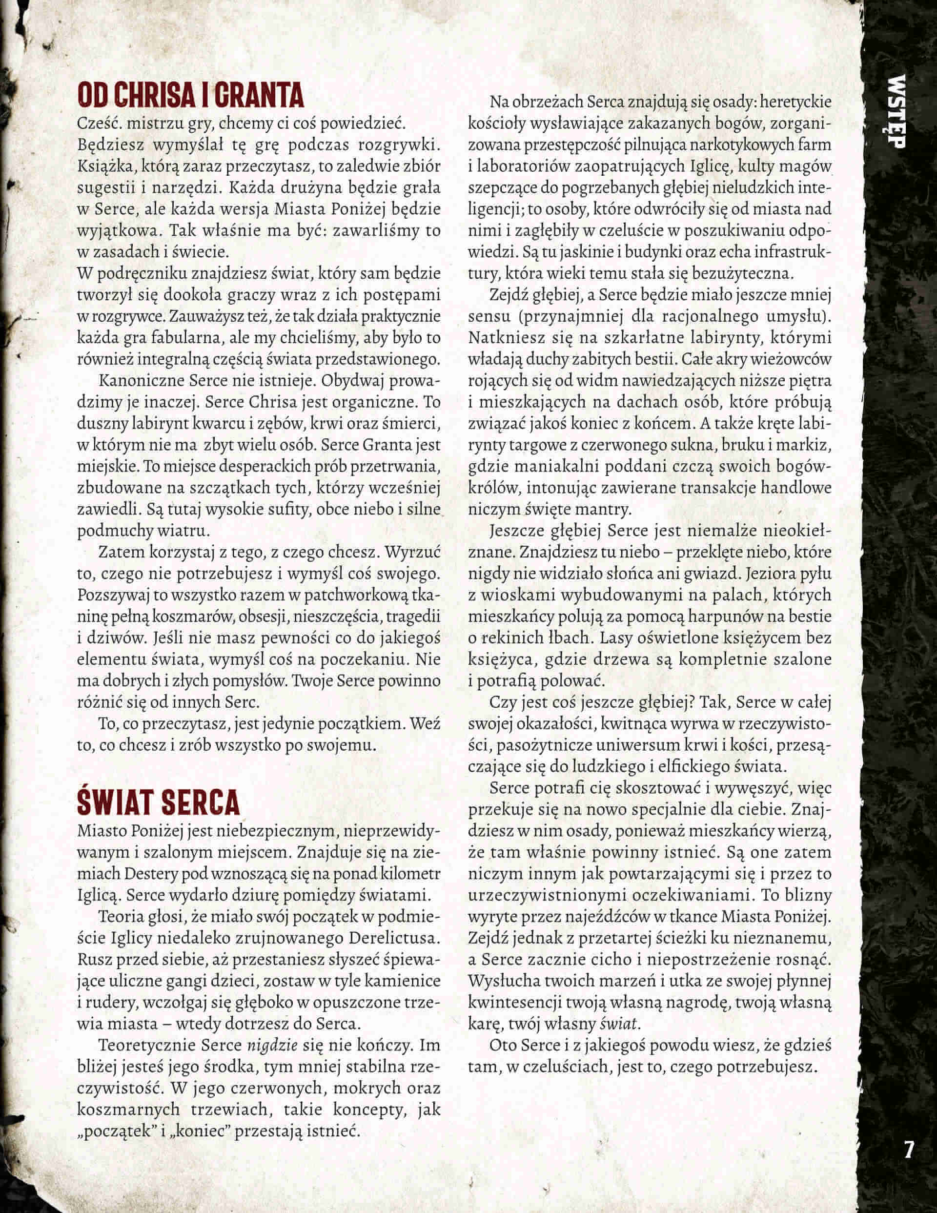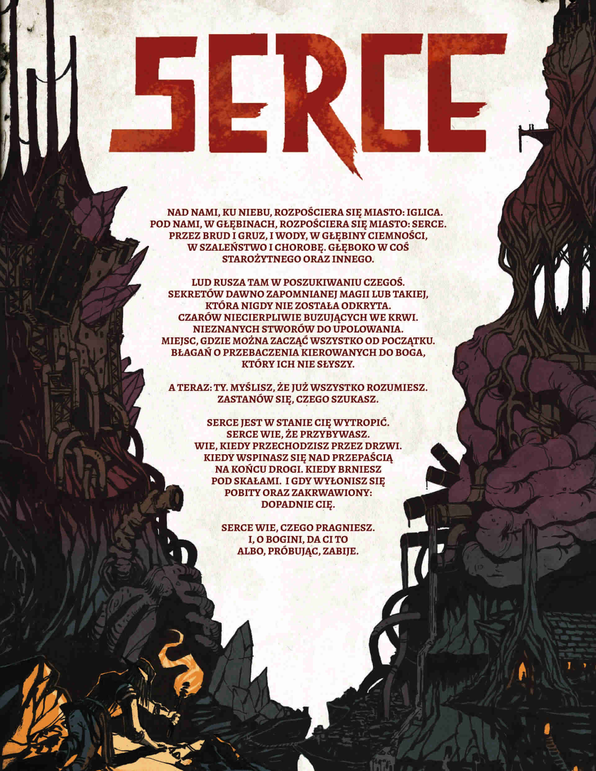 Serce: Miasto Poniżej to gra fabularna o wżeraniu się coraz głębiej w koszmarną metropolię, które da ci wszystko to, o czym kiedykolwiek marzyłeś – albo zabije cię, próbując. To napędzana przez fabułę gra o eksplorowaniu podziemi, która skupia się na tym, co postacie graczy mają do stracenia, goniąc za swoimi marzeniami przez chaotyczny mrok podziemnego świata.